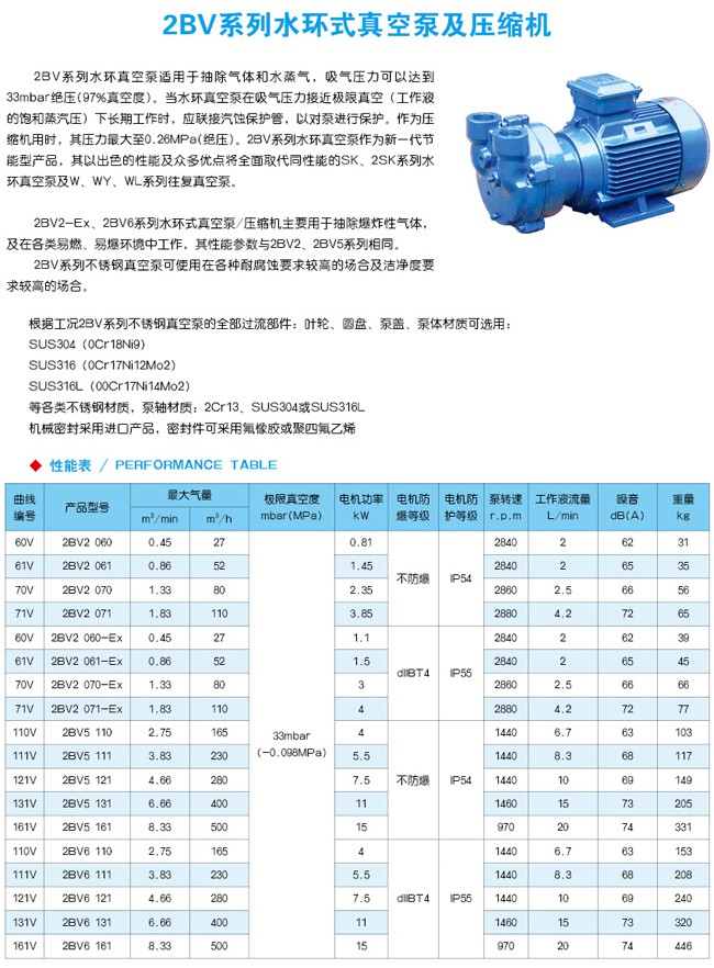 2BV水環(huán)真空泵適用于抽除氣體和水蒸氣,吸氣壓力可以達到33mbar絕壓(97%真空度)。當真空泵在吸氣壓力低于80mbar的狀態(tài)下長期工作時,應聯接氣蝕保護管,以對泵進行保護。如配大氣噴射器,吸氣壓力可達10mbar,噴射器可直接安裝在真空泵上。作為壓縮機用時,其壓力至0.26MPa(絕壓) 。